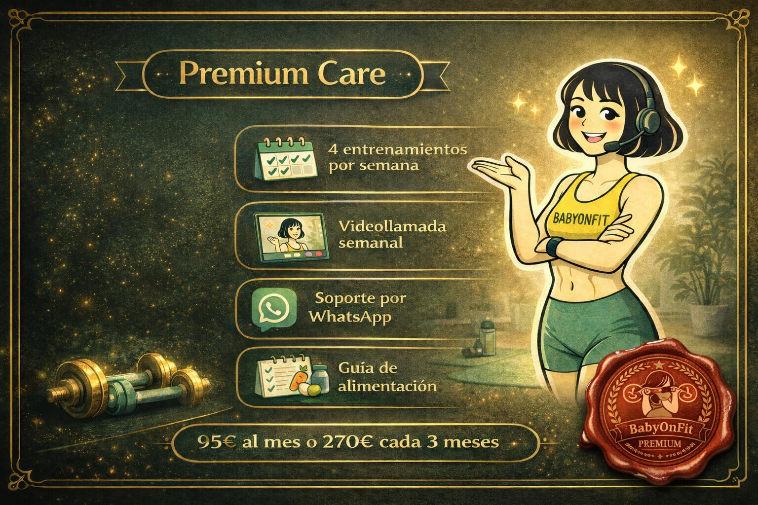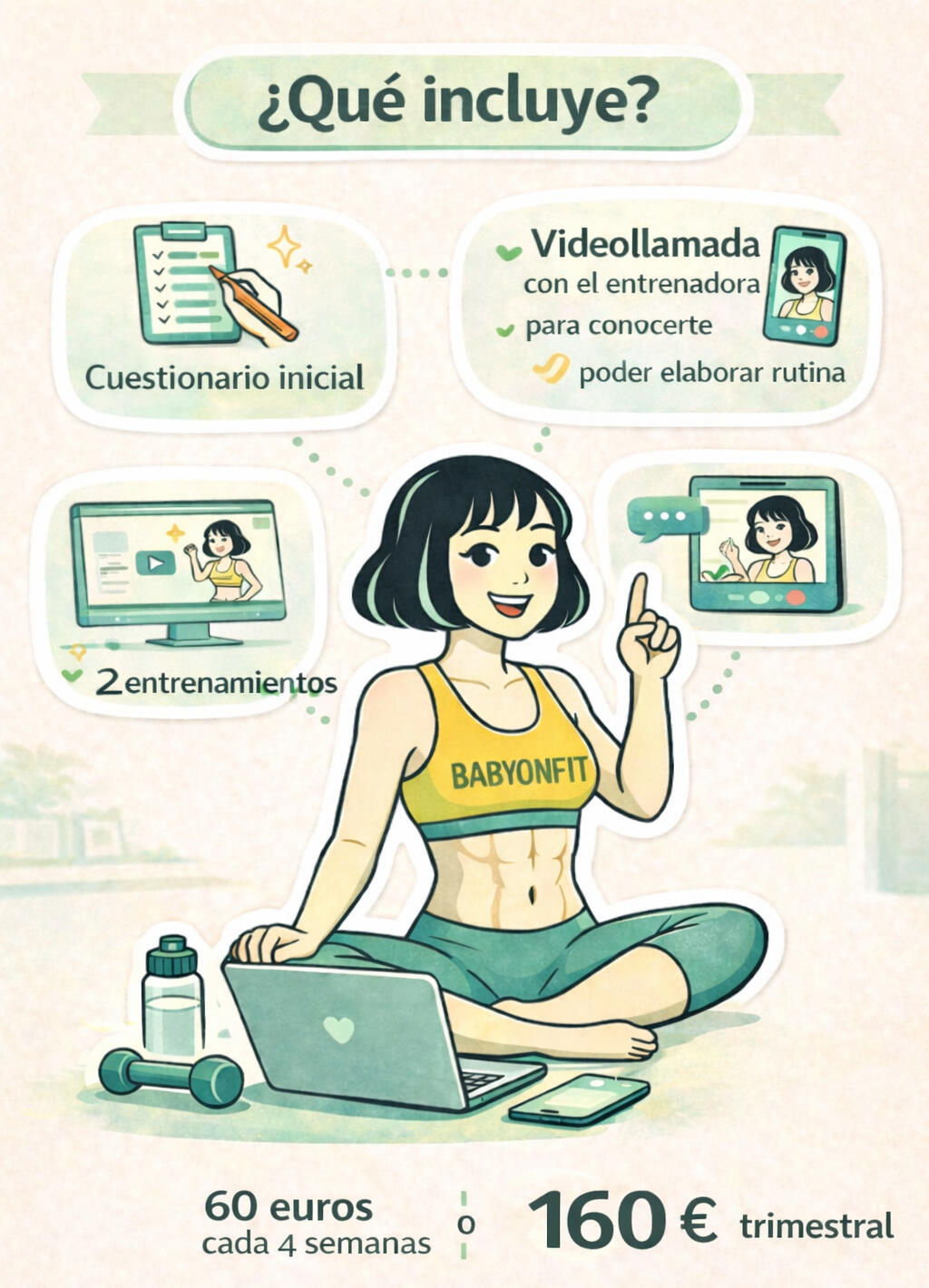 Entrenamiento 100 % adaptado, seguimiento cercano, videollamada semanal para comprobar los avances, soporte por WhatsApp y todo lo que necesitas para sentirte fuerte y acompañada en esta etapa, ya sea embarazo o posparto.¿Qué incluye?Cuestionario inicial y videollamada con la entrenadora4 entrenamientos a la semana, durante 4 semanas que se repite el mismo entrenamiento (tienes la opción de visualizar el ejercicio en vídeo en la plataforma para ver cómo se hace correctamente)1 sesión privada de videollamada semanal con la entrenadoraWhatsApp coach con respuesta antes de 24 hsRecomendaciones de alimentación y suplementación en una pequeña guía95€ al mes o 270€ cada 3 meses.
